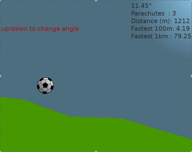 Try to go as fast as possible. If you bounce too high a parachute will deploy because this ball is afraid of heights! Mouse or touch-drag up and down to change the angle of the hill.